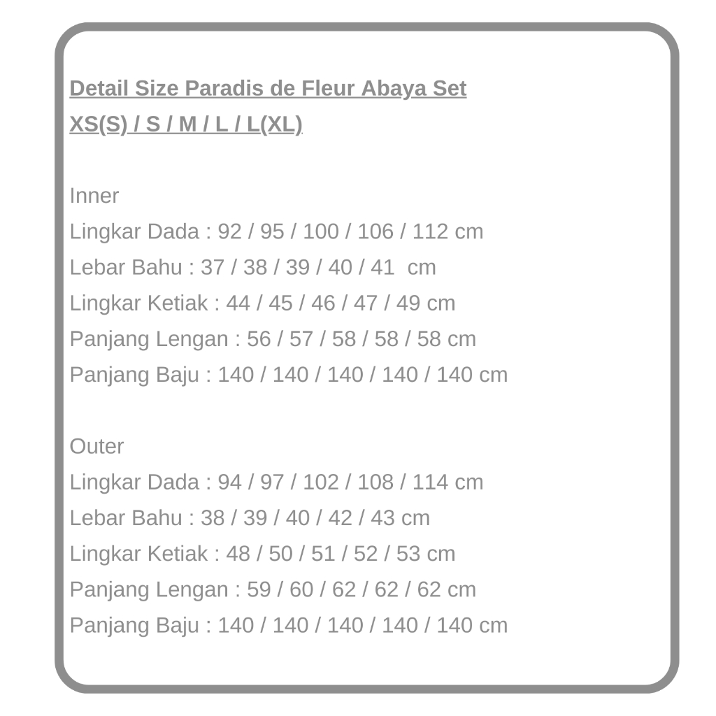 Bahan inner tebal, semi satin, mewah dan bahan terbaru kita 2026.. Bahan Outer Bordir tebal, halus, rapi sempurna flowy nya.. Tidak ada minus di Paradis de Fleur kita cek berkali-kali..
